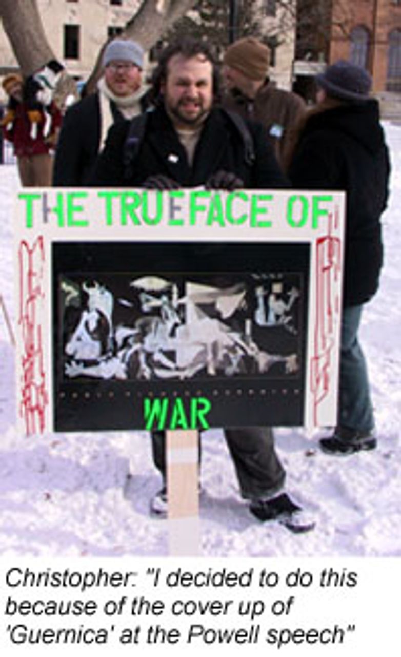 The WSWS spoke to Christopher, a graduate student at MSU, who made a sign against the war with a poster of the “Guernica” painting by Picasso. He said he had read the WSWS article on the decision of the Bush administration to cover up the Guernica tapestry at the United Nations when Colin Powell gave his February 5 report.
