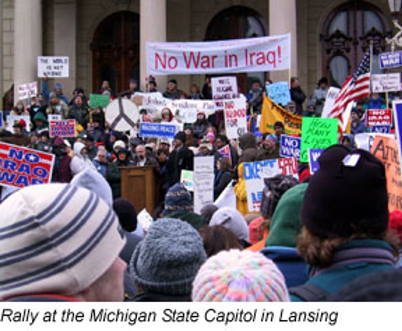 Local Democratic Party officials addressed the crowd at the concluding rally. When Lansing Mayor Tony Benavides made a gesture of appreciation for American soldiers going to the Persian Gulf, the crowd let him know that rather than sending them good wishes he should call for the troops to be brought back home.