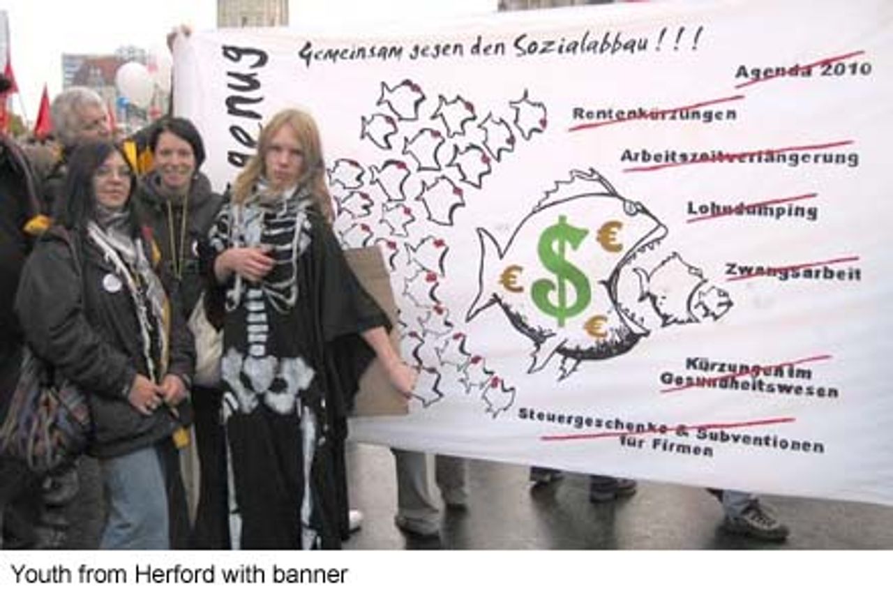 The huge, colourful and militant march wound its way through the centre of Berlin, bringing traffic to a standstill for several hours. Placards on the demonstration read “Agenda 2010—neo-liberal and anti-welfare,” “Young people must fight for their future, For training, education and jobs,” and, in a play on words based on the initials of the governing Social Democratic Party (SPD), “They Plunder Germany.” Other banners and chants on the demonstration called for a general strike and the resignation of the government.