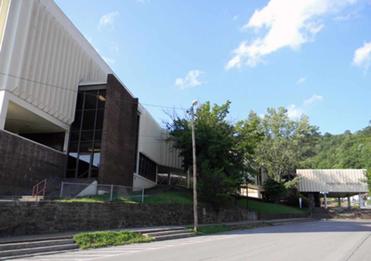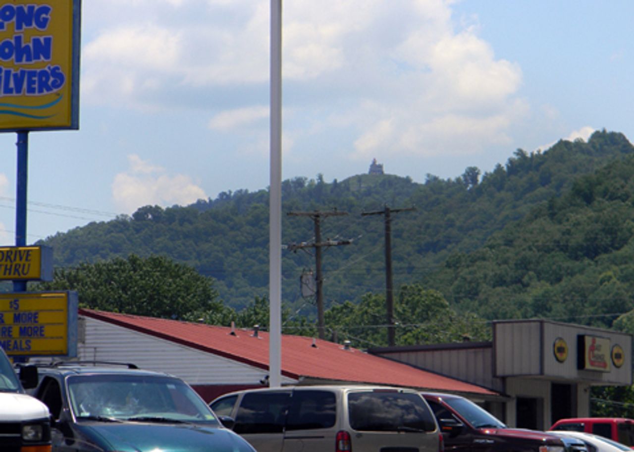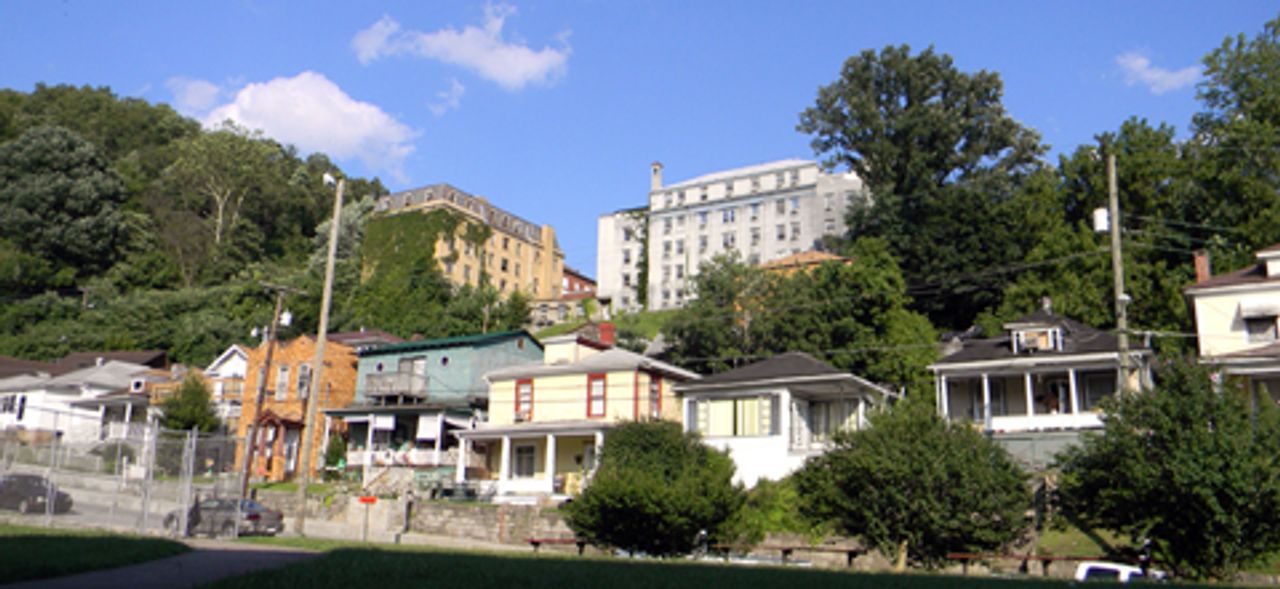 A section of downtown Williamson. At the top of the hill stands the former hospital.