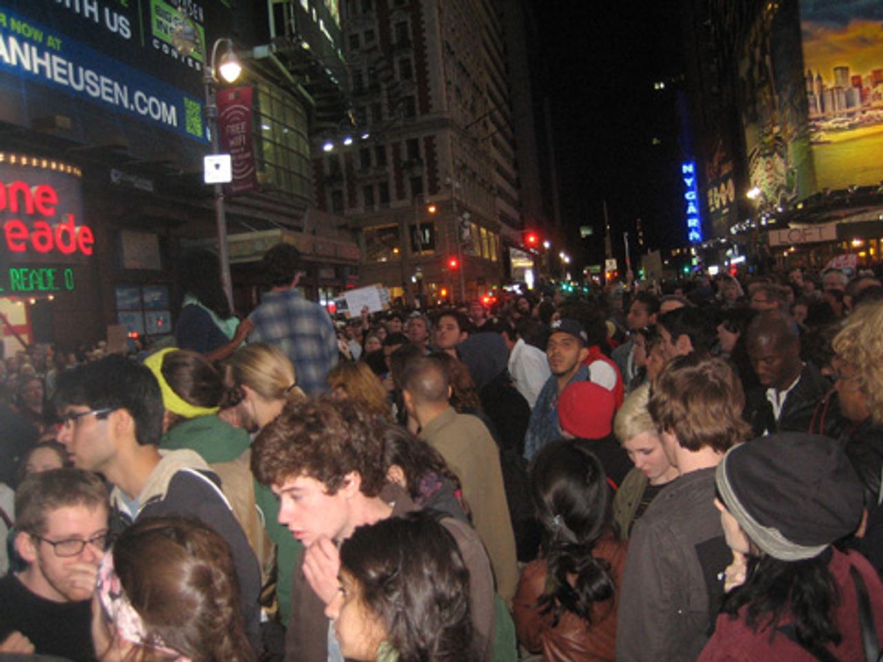 Thousands of people demonstrated in Times Square, the heart of New York City, Saturday as part of the worldwide protests against social inequality and Wall Street.