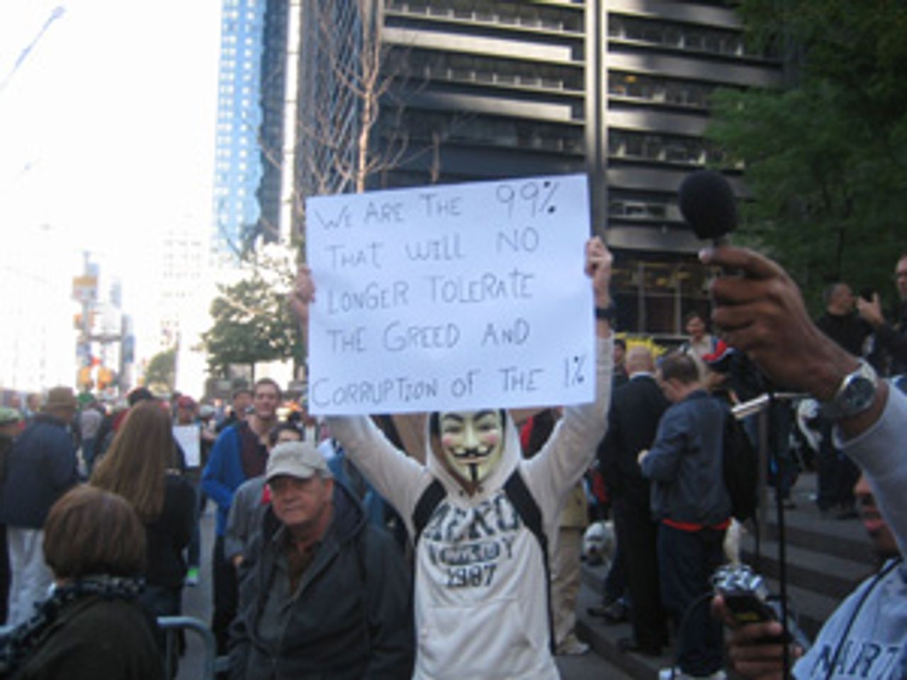 Protesters carried homemade signs and placards that read, “We are the 99%. We will no longer tolerate the greed and corruption of the 1%!” and chanted, “Banks got bailed out, we got sold out!”
