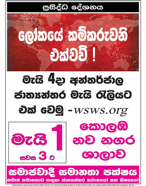 සමාජවාදී සමානතා පක්ෂය (සසප) හා සමාජ සමානතාව සඳහා ජාත්යන්තර තරුනයෝ හා ශිෂ්යයෝ, ලෝක සමාජවාදී වෙබ් අඩවිය හා හතරවන ජාත්යන්තරයේ ජාත්යන්තර කමිටුව විසින් සංවිධානය කර ඇති, මැයි 04 ඉරිදා පැවැත්වෙන, අන්තර්ජාල ජාත්යන්තර මැයි දින රැලිය සඳහා උද්ඝෝෂනයේ කොටසක් ලෙස, මැයි 01දා කොලඹදී ප්රසිද්ධ රැස්වීමක් පවත්වනු ලබයි.