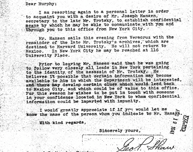 ජාත්යන්තර කමිටුව එලිදරව් කරගත් තවත් කරුනක් නම්, ට්රොට්ස්කි ඝාතනයට යන්තම් දින 10 කට පසු ජෝසප් හැන්සන්, එස්ඩබ්ලිව්පීය ට මුලුමනින්ම නොදන්වා මෙක්සිකෝ සිටි නගරයේ එක්සත් ජනපද තානාපති කාර්යාලයේ එෆ්බීඅයි ඒජන්ත්යෙකු සමග රහසිගත හමුවීම් මාලාවක් ආරම්භ කල බව පලමු වතාවට ඔප්පු කරන එක්සත් ජනපද ආන්ඩුවේ ලියවිලි ය.