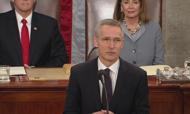 රැස් වූ එක්සත් ජනපද සෙනේට් සභිකයන් හා කොංග්රස් මන්ඩල නියෝජිතයින් විසින් 18 වතාවක් හිටගෙන අත්පොලසන් නැගීමෙන් ස්ටොල්ටෙන්බර්ග්ගේ නීරස කතාවට බාධා කෙරුනි. තමා නව සීතල යුද්ධයක් ගැන බල කරමින් කථා නොකරන නමුත්, නේටෝ සන්ධානයේ කේන්ද්රීය අක්ෂය මොස්කෝව සමග මිලිටරි ගැටුමක් සඳහා සූදානම් වීම බව පැහැදිලි කලේ ය.