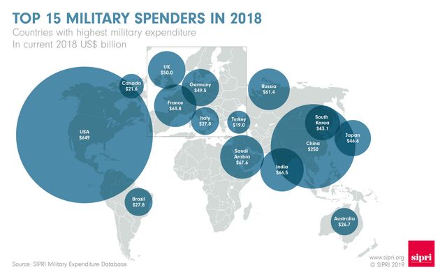 ස්ටොක්හෝම් ජාත්යන්තර සාම පර්යේෂන ආයතනය (සිප්රි) මේ සතියේ ප්රසිද්ධ කල වාර්ෂික වාර්තාවකට අනුව, 2018 දී ඩොලර් ටි්රලියන 1.8ක ඉහලකට නැගෙමින් ගෝලීය මිලිටරි වියදම පශ්චාත්-සීතල යුද්ධ නව ඉහලකට ලඟා වී ඇත. මෙය පෙර වාර්තාගත වාර්ෂික අගය වූ 2017 ලෝක පරිමාන මිලිටරි වියදම්වලට වඩා සියයට 2.6ක වැඩිවීමක් සලකුනු කරයි.